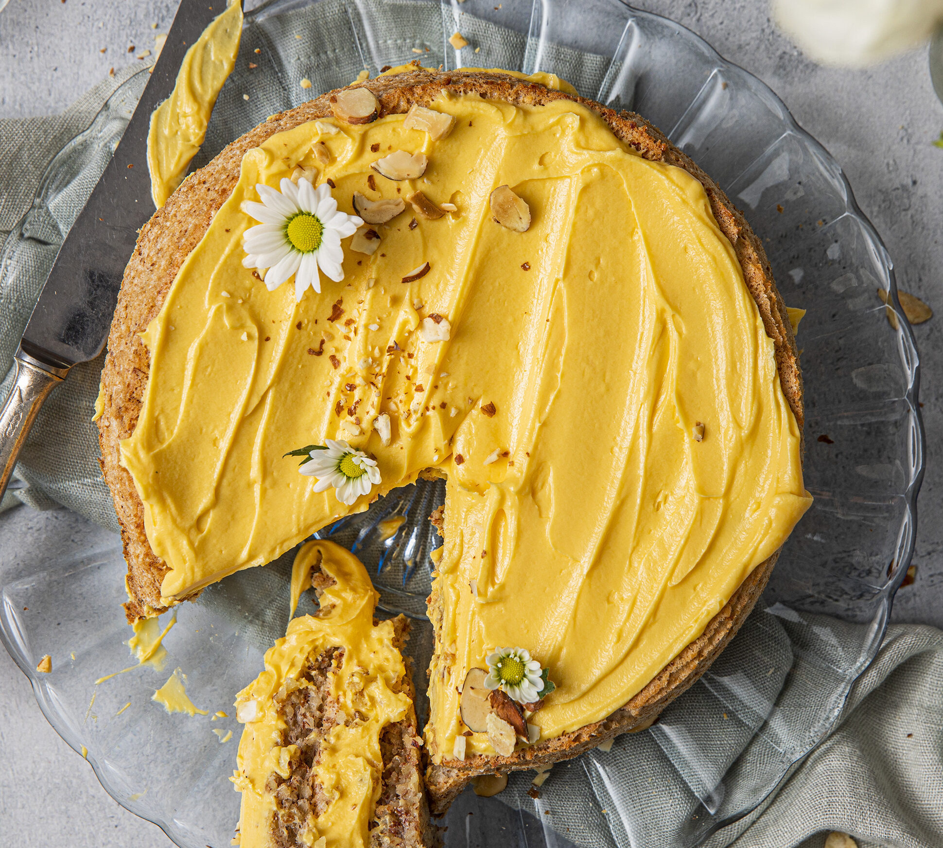 Legg mandelbunnene oppå hverandre med litt gul krem mellom lagene. Fordel resten av kremen over og rundt på kantene. Pynt med ristede skivede mandler og/eller friske bær.